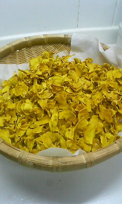 ファンヒーターの前で温風にさらすこと10時間あまり こんなにきれいな黄色いウコン切片の出来上がり |