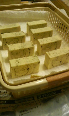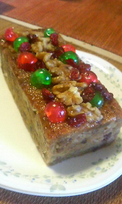 11月の終わりから、ラップとアルミホイルに包んで カンカンに入れて熟成させていたケーキ (どーなってんのかナー 中身が気になって) 出来上がりにたっぷりブランデーを振りかけたので 酔っぱらいそうな・・ でも、なかなか芳醇な大人のケーキ(自画自賛) |
