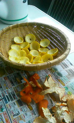 ミカンの皮と、ポン酢を作ったあとの柚子の皮を ベランダで干しました 皮だって捨てたらモッタイナイ |