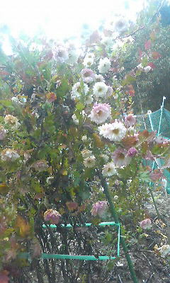 去年はヤマイに取りつかれて 散々だったクーベルト 手厚い(!)手当てのかいあって こんなに綺麗に咲きました 鋭い棘で固く身を守りながら (うっかり近寄ると怪我をするほど スゴイ!)次から次へと咲いて くれます |