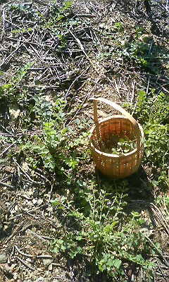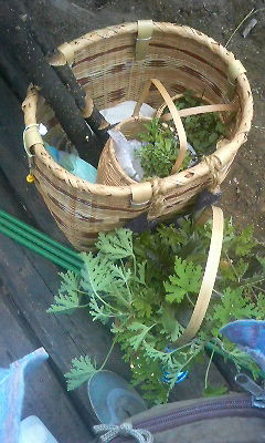 今日の収穫物 手前の篭の中には、今ごろでもみずみずしい グリーンの葉っぱのゼラニュームとクリスマス・リース用に ローリエの葉っぱが少し 大きな篭の中の棒っ切れのようなのは 伏せ込み用のタラの木 |