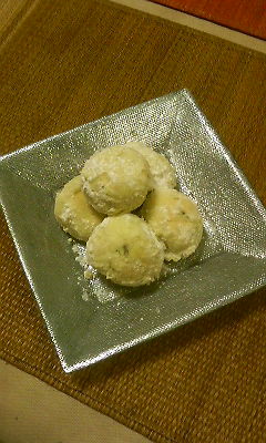 <アーモンドボール> バターと小麦粉、ベーキングパウダー 砂糖、卵を練った中に、 ローズマリーのみじん切りと砕いたアーモンドを タップリ入れて丸め、オーブンで焼きました 仕上げに粉砂糖をふりました |