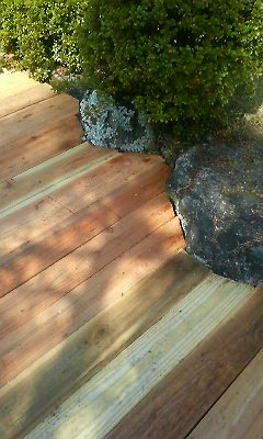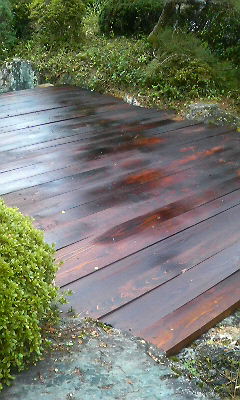床の板を並べたらウッドデッキらしく池のカーブに沿って 板の端を切るのが一番たいへんでした |
