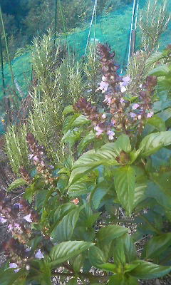 今夏のこの猛暑!皆さま如何お過ごしでしたか? ジャルダンの植物たちの様子をみると、 酷暑の夏もどうやら終息に向っているようです 夏の太陽を連日浴びてすっかり木質化しているバジルは なかなか存在感のある花を咲かせています |
