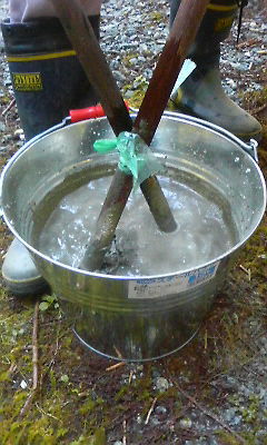 草木灰入りの熱湯に浸けたまま一晩おきます |