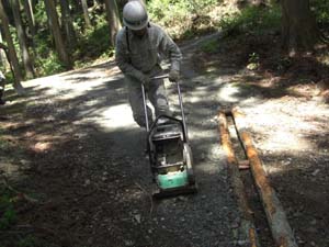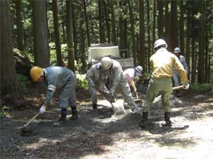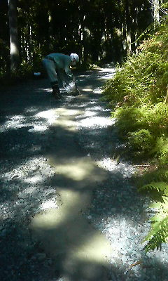 発展途上のジャルダンの整備には、なかなか過酷な 仕事がいっぱい! 梅雨末期の集中豪雨で、6月に直したはずの道路に 大きな亀裂が! 車のタイヤがはまってしまうような深い穴に砂利を詰めて 上からセメントを塗りました また台風もやってくるでしょうし・・焼け石に水かもしれませんが・・ |