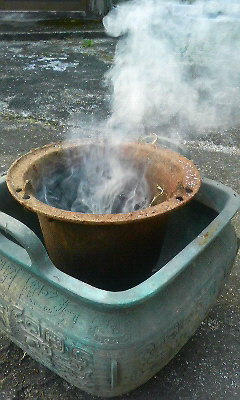 火鉢やらストーブやらの部品を 廃物利用した囲いの中に炭を熾こして ローズマリーとラベンダーをくべてみました どんなにいい香りがするかと期待しましたが・・ |
