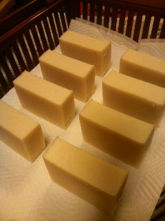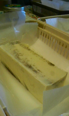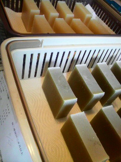 切り分けたあとはこのまま約二か月熟成させます 今回は他にも、薔薇石鹸、あずき石鹸、そして シアバターたっぷりの(熟女好み?)MARIKO石鹸 が新春デビューしました |