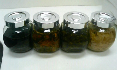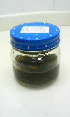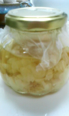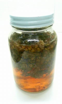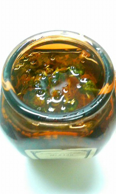 これはニンニク、唐辛子、粒胡椒も入れて、 オイルに浸けたものです |