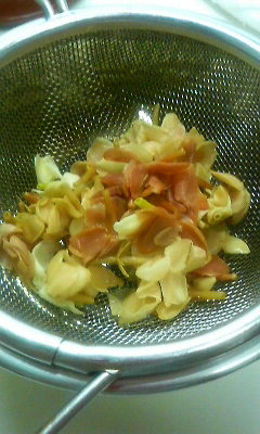 さて、これからがたいへん! 水で綺麗に泥を落としたら 生姜に付いてるようなハカマを丁寧にこそげ落として (この間立ちっぱなしの水仕事!)・・ それからスライサーでスライス |