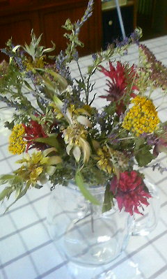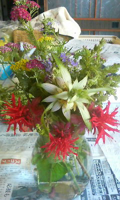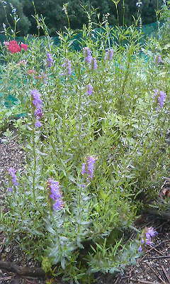 夏の間中、採っても採っても絶え間なく咲いていた ダイアーズカモミール、ヤロウ、タンジー、ベルガモットに 代わって、千日紅とアニスヒソップ、チェリーセージが 秋に向かうジャルダンを彩ってくれています |