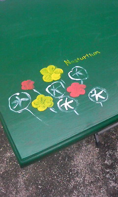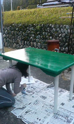 スチールの足を付けて、座卓に戸外用の ペンキを塗りました |