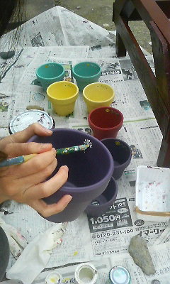 ついでにこんなものにも・・ 納屋に転がっていた錆びた一斗缶に色を塗って、 |