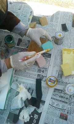 防腐剤塗り マスクにメガネと手袋の重装備で |
