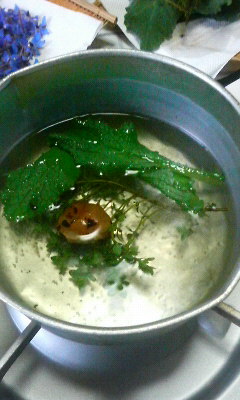 今あちこちに植わってるローズマリーが 可憐な花を咲かせています ハンガリー水には、薬効に優れているこの花盛りの頃の ローズマリーを浸けると良いとか ウコンは近所の達人のおばあちゃんに 花は早く採ってしまわないと株のためにならないよ、と 教えて頂いたので切り取ってお風呂に入れました 南国のリゾートのお風呂みたいでした ゴクラク、ゴクラク |