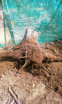 レモンバームの種まきをしようと 思い立って耕し始めましたが、大きな切り株に繋がる 根っこにぶち当りました ツルハシで持ち上げてミシミシ揺り動かしていたら こんな大きな根っこが現れました |