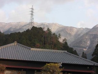 決まって初午大祭の頃は寒いと 言われている通り、ポカポカ陽気が 一転して昨日は大荒れ! 空は晴れているのに、雨混じりの 風が・・と思ったら、いつの間にか山は 真っ白な雪でした 『ジャルダン』は手前の低い山の 左下方に |