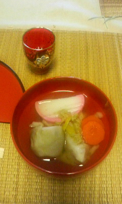 ハーブをオセチに使ってみました お雑煮の上に菊の花びら |