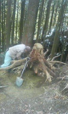 9月の台風がもたらした大崩落以来 まるで大きなタコのような根っ子に 張り付かれて苦労していた杉の木を 毎日々少しづつ掘り進んで やっと救出 |