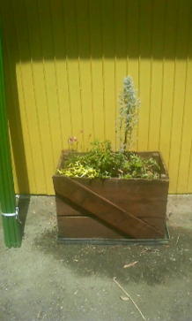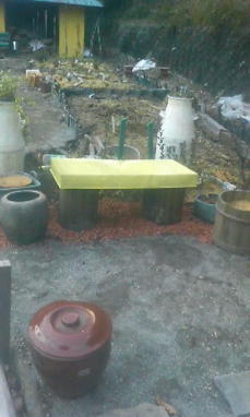 ブリキの衣装カンの蓋に 黄色いペンキを塗って 即席のベンチに 仕立てましたが・・ 体重制限あり |