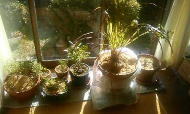寒さに弱いハーブを 縁側に待避させました 左から チャイブ レモンゼラニューム レモンの挿し木苗 レモンマートル レモングラス レモンユーカリ |
