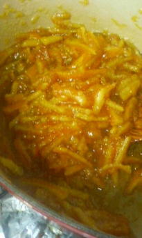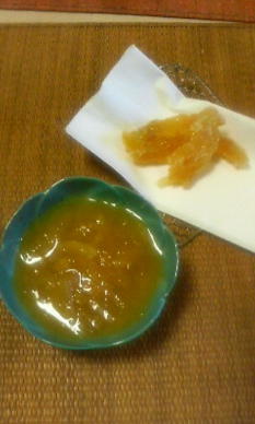 皮を三回ほど茹でこぼしたあと身を合わせて、 夏みかんの目方の半量の砂糖をいれ、 アクをとりながら煮詰めます トロミが出てきたら、別に煮ておいた、種から取ったペクチンを 加えて更に煮詰めます |