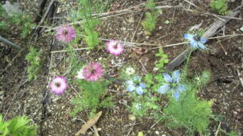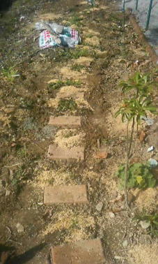 ジャルダン人アリが運んだ先「ルミノガーデン」の荒れ地に 栄養たっぷりの山の土が入って、パーゴラの横にも 植栽が可能となりました(レンガの道に沿ってオレガノ、 カモミール、ミント、レディースマントル・・) |