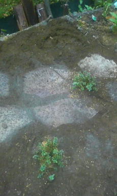 どしゃ降りのあとになると 足をとられてしまうほどのぬかるみとなる場所に 砂をシコタマ入れました 家で余っていた敷石を所々に嵌め込んで 間にミントを植えてみました |