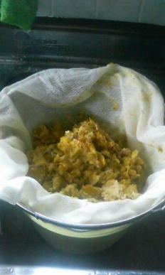 5日おいた柿を 木綿手拭いか、蒸し器に入れる大きな布巾でギュッ 汁は別にとっておいて カスはもう一度ビンに戻します(二番絞り用) |