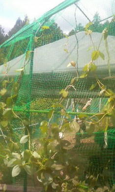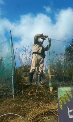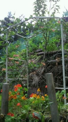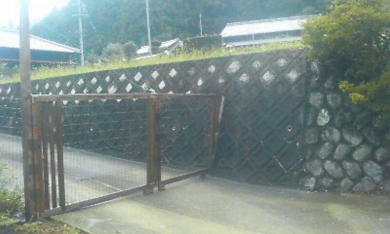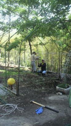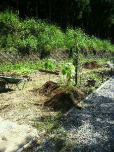 門扉ができるまで、納屋から出てきた パイプの枠組みに網をはって、 網の囲いに続く取りあえずの入口を 作りました 通りかかった人から鹿でも飼うの?と 冷やかされますが、こうしておかないと 色んな動物に入られて 植栽したものを荒らされてしまいます |