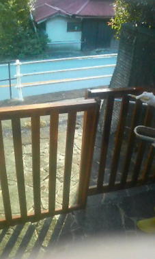 ←凹の切りこみ 門扉を階段の途中に付けようとしたため、門柱を立てるのに、う〜む・・ 取り付ける方法を夜通し考えてたみたい 閃いたのが、階段の左右に取り付けられた転倒防止用の手すり 門柱に凹の切り込みを入れて手すりを挟み込む形で固定する、というアイデア! |