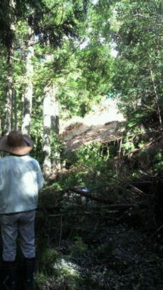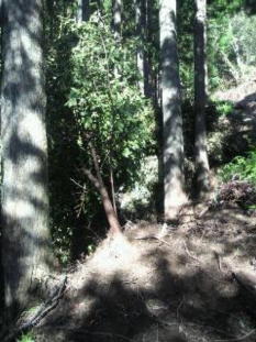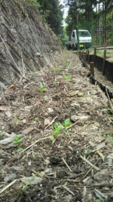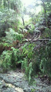 本来なら山肌に立っていたはずの雑木 土砂と共に流れて無事に道路脇に着地 |