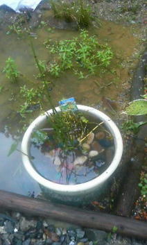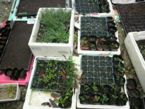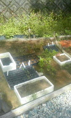 この「ビオトープ」、 種蒔きのあと、腰水で育てるのに丁度良くて 秋まきの種の苗置場になってしまいました |