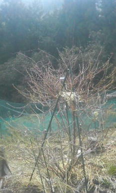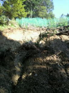 以前は下からは木で隠れてほとんど見えなかった 鹿よけフェンスが丸見えに フェンスギリギリに植えられていた梅の木は 斜面中腹で無事着地 (←梅の木) |