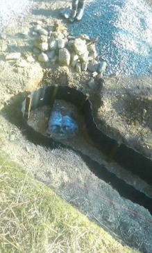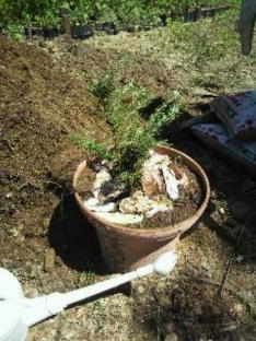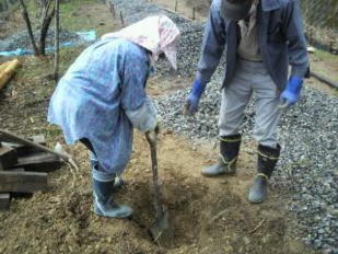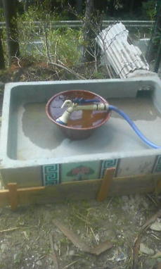 何しろ何十年も埋もれていたホースは、 中に砂利が詰まっていて、 開通させるのはホネが折れましたが、 振ってみたり地面に打ち付けたり・・ やっと水が通りましたヤッター! |