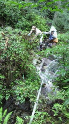水工事 昔々、何十年も前に、 隣の谷の上流にコンクリートで水源工事を施して、 水を引き入れていた家があって、 よくよく探してみるとその時のホースが残っていました |