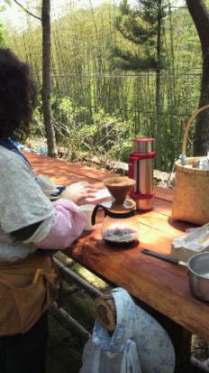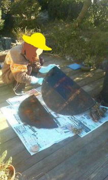仕上げは、何と言っても、か・き・し・ぶ ←柿渋を塗るAの手 |