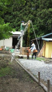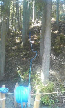 下方1/4くらいはホースが足りなかったので、 ブルーの放水ホースを接いで間に合わせました |