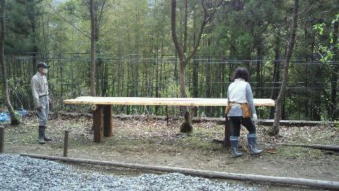 重い丸太の下敷きになることもなく 2つの丸太は無事立ちました |