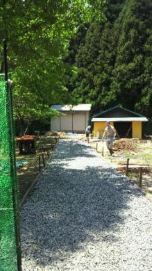 入口から砂利道に沿って作っている粘土入り舗装の 「土の道」もだいぶ長くなりましたが、粘土の割合が その都度アバウトで・・微妙に色のトーンが違っています 「手作りの味」ということに・・ まだまだ「ルミノ」は工事中 土の小山や資材やらバケツやらが散らばって 通りがかった方は首を傾げて見て行かれるみたいです |