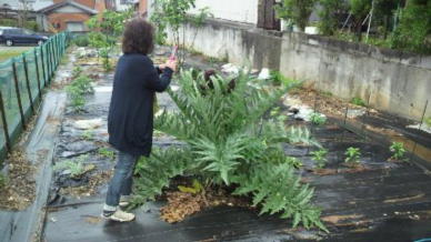 排水溝工事 大型重機満載して現れた、ゴージャスな助っ人T氏が ユンボで地ならしし、排水溝を掘って、 風のように去っていかれたあと、 はて?溝にはU字溝? 重た〜くて値段もケッコウするあのコンクリートの構造物を 使用しないで、雨水処理できる代用品はないもの? 徹底的に創意工夫の(実はおカネがないだけですが・・) ジャルダン人Bが閃いたのが・・田んぼの畦シート! 従来の波形のより、材質も形状も一段進歩したものを、 農家の友、コ○リで見つけました。 シートを張り杭を打ち、これで大丈夫!・・かどうかは 大雨が降ってみないと分かりませんが、 あとは追々底にコンクリートを流すことにして、 取り合えず側溝のメドは立ちました |