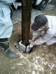 普通の行程では底に砂利を敷いてから コンクリートを流し入れて丸太を固定させるのでしょうが ジャルダン人BはU字溝とその蓋の間に 丸太を突っ込んで固定させる、という U字溝作戦を考えつきました |