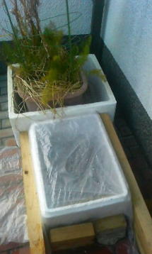 もう少し気温が上がってくれば食べられるサイズになるハズ 水を変えて、またビニールをかぶせておきました |