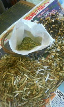 チャングム粉 ナニを隠そう、韓国ドラマ大好き!でして・・・ 一世を風靡した(?)チャングムの後半で、名もない庶民の 生活の知恵として紹介されたこのダシ粉を、のんびりできる 今ごろのシーズンに、毎年作ることにしています 材料は、煮干し、干し椎茸、昆布、干した大根の葉 煮干しは腹ワタを取り除き、身は頭と胴体にわけて 身は裂いておきます(これが第一のお手間いり) 昆布は細切り、椎茸は小さく割っておきます |