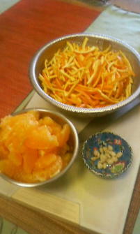 皮で砂糖菓子を作ってみました 実のまわりについているふわふわしたワタをはいでから 細切りにした皮を、砂糖水で煮ると こんなに透き通って煮上がります |
