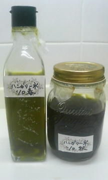 冷蔵庫にストックしてあるハンガリー・ウォーターの原液 左が春、右の少し色が濃いのは秋物 (ハンガリー・ウォーターの材料については2010.7.20ブログを ご参照ください) 花が咲いた時期のローズマリーが一番薬効があると聞いて 秋にも浸け込みましたので、使いきれないほどのストック 興味を持たれた方にはプレゼント致しますので どしどしメールを!! |