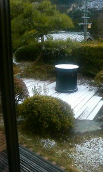 池デッキの上の味噌樽(2010年11月7日のブログに掲載)に 雪が積もりました 山間部の冬は厳しく、よほど穏やかなお天気でないかぎり ハーブの世話をしに山に登る気にはなれません それで・・ 温かくした居間から日がな1日味噌樽を眺めることに・・ |