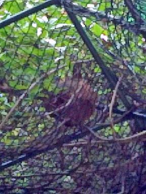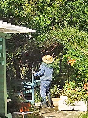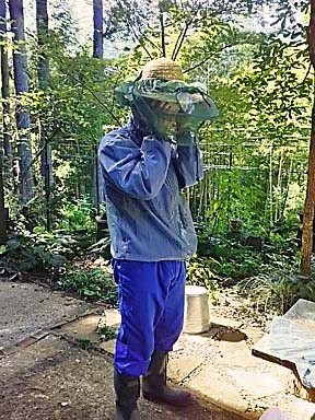 2〜3日後、案の定生残り部隊が 巣を作り直しているのを発見! 可哀想だけど やるっきゃない! 頭には防虫網をかぶり、 服の上にアミアミの防御服を重ね着して いざ いざ! |