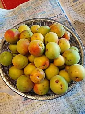 頂いた梅の実のうち まだ青いのは洗って ヘタをとって フォークで少しつっついて 冷凍しておきました 黄色く熟し始めたのはジャムに |
