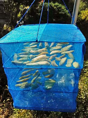 掘ったばかりのさつま芋は日保ちがしませんし 充分な甘味も出ていないので しばらく天日に当てて干してから加工します 蒸して、熱いうちに皮を剥いて、テグスで切って 吊り篭に並べて干しました 良いお天気が少なくとも三日は続くのを見越して 天気予報とにらめっこ |